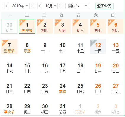 2019年10月1日至10月7日(周二至下周一)放假调休,共7天;10月8日(周二)正式上班。