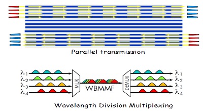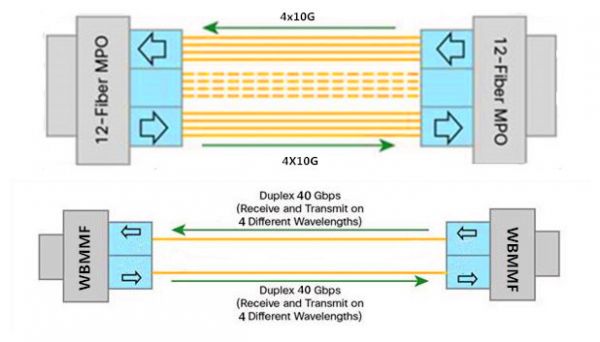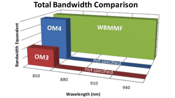 进入2010年代,随着100G-NG,200G/400G以太网乃至1T以太网的提出,传统的多模光纤在芯数和距离上成为阻碍未来以太网络发展的瓶颈,而宽带多模光纤(WBMMF)的出现打破了传统多模光纤的技术瓶颈。它借鉴了单模光纤的波分复用(WDM)技术,延展了网络传输时的可用波长范围,能够在一芯多模光纤上支持4个波长,把需要的光纤芯数降低为之前的1/4.