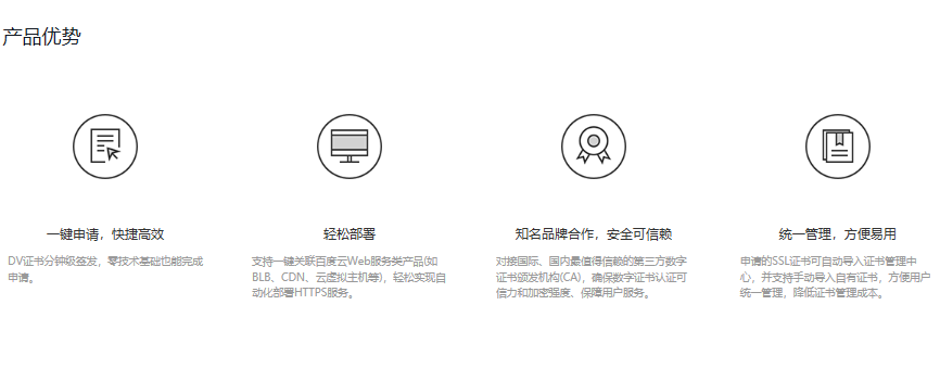 腾佑科技河南省百度云服务中心为您提供SSL证书服务,百度云与全球知名的第三方数字证书认证和服务机构联合推出的SSL证书申请与管理一站式服务。无需繁杂流程,一键申请,轻松实现网站与Web应用的HTTPS加密部署。如有需要SSL证书服务的用户请点击链接咨询:http://www.tuidc.com/baidu/ssl.html