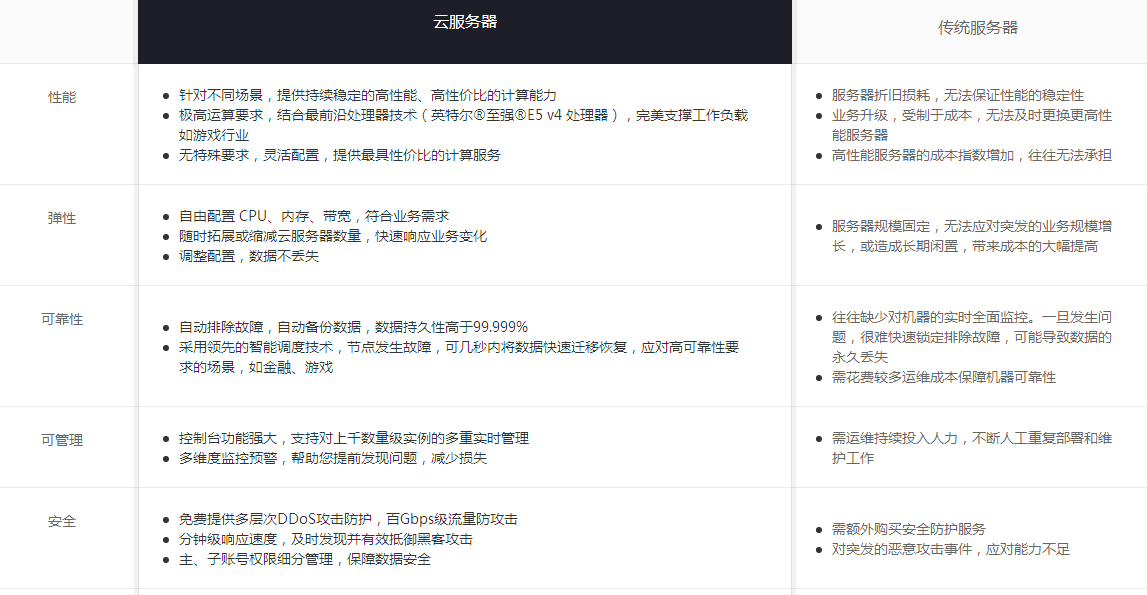 云服务器相对比传统的物理服务器,从性能、弹性、安全性、可靠性、可管理、成本方面考虑都有着极大的优势,云服务器基于虚拟化、分布式集群等技术构建的云端计算服务。云服务器针对游戏行业运维工作量大、运维自动化要求高的场景需求,提供高性能云产品助力中小型游戏企业轻松部署业务。