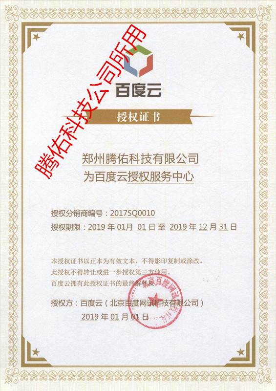 百度智能云河南代理是腾佑科技公司,百度云智能云授权腾佑科技公司成为河南的总代理商,作为百度智能云的河南服务中心。腾佑科技公司致力于IDC领域、服务器发展12余载,享有丰富的经验以及深厚的资质。