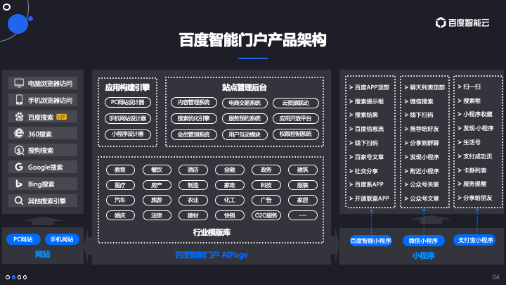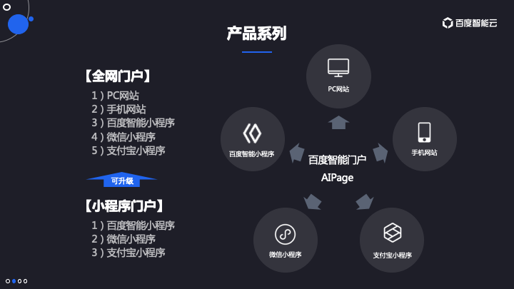 百度智能门户【AIPage】是百度智能云面向中小企业用户推出的一款智能化构建网站和小程序的SaaS应用产品。用户无需任何编程基础即可上手操作,如同做PPT一样拖拽式设计制作自己的网站和小程序。轻松打造“PC网站、手机网站、百度智能小程序、微信小程序、支付宝小程序”五个端的站点。