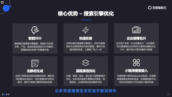 百度智能门户【AIPage】融入智能SEO系统,针对各大搜索引擎进行优化,集成多项百度系企业营销产品,保证百度收录,让你获取客户更加轻松。