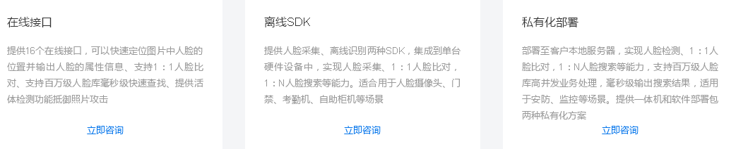 提供16个在线接口,可以快速定位图片中人脸的位置并输出人脸的属性信息、支持1:1人脸比对、支持百万级人脸库毫秒级快速查找、提供活体检测功能抵御照片攻击。