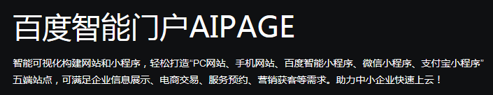 简述:百度智能门户(AIPage)是百度智能云面向中小企业用户推出的一款智能化构建网站和小程序的SaaS应用产品。用户无需任何编程基础即可上手操作,如同做PPT一样拖拽式设计制作自己的网站和小程序,内置海量