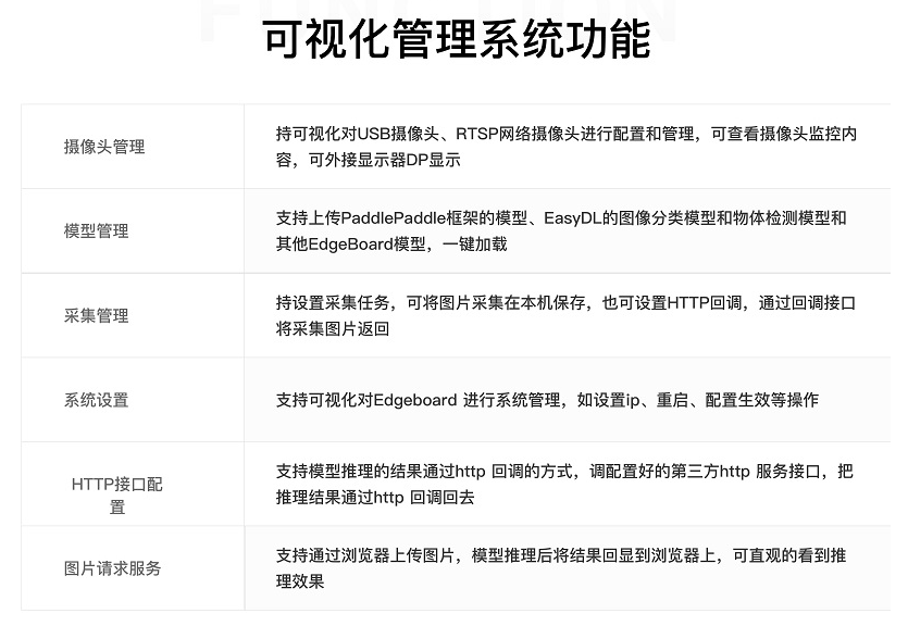 部署简单:内置EdgeBoard管理系统,可视化操作。支持HTTP访问,外设接口丰富,支持二次开发