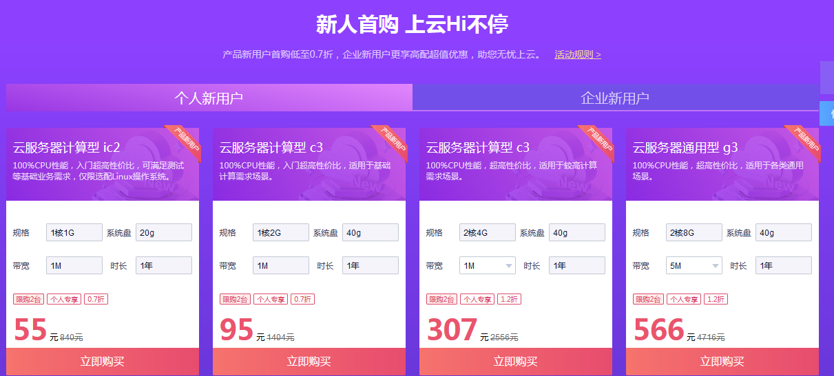 云服务器0.7折起,AI低至1元。产品新用户首购低至0.7折,企业新用户更享高配超值优惠,助您无忧上云。