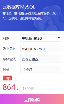 简述:云数据库MySQ单机版1核2G优惠价格多少钱? 云数据库MySQL 高性能、高可靠的关系型数据库服务,适用于AI、互联网、游戏等丰富场景。 规格单机版1核2G 版本系列MySQL5.7/8.0