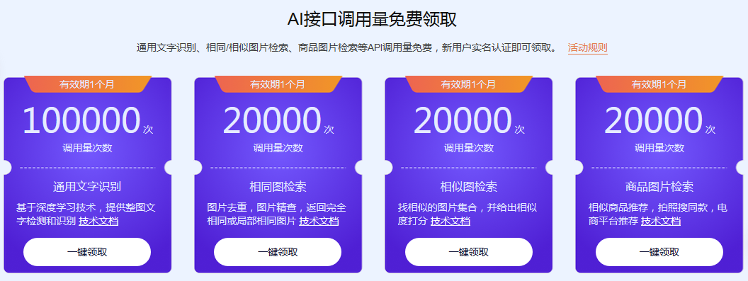 4款AI调用量免费领。通用文字识别、相同/相似图片检索、商品图片检索等API调用量免费,新用户实名认证即可领取。