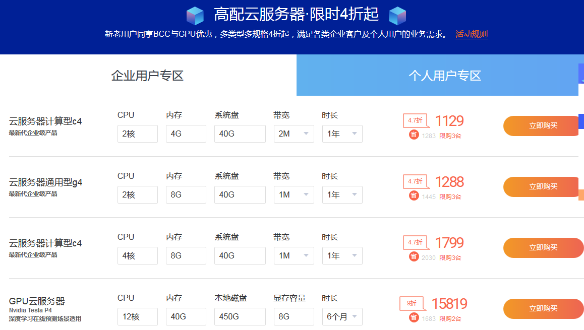 全场4折起。新老用户同享BCC与GPU优惠,多类型多规格4折起,满足各类企业客户及个人用户的业务需求。
