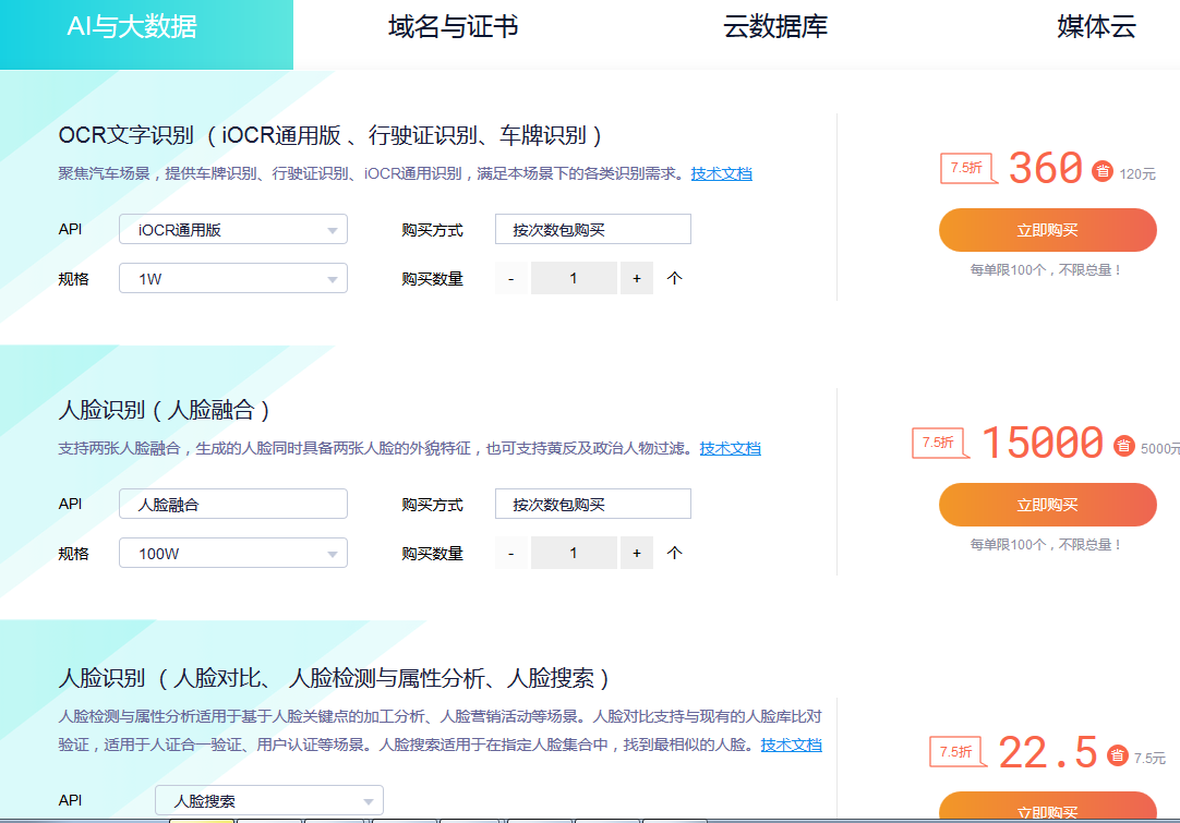 简述:普惠上云节,布局新基建。云服务器1.2折,AI产品7折,媒体云5.5折起 活动福利有哪些?1、新人专享福利4款AI调用量免费领。通用文字识别、相同/相似图片检索、商品图片检索等API调用量免费,新用户
