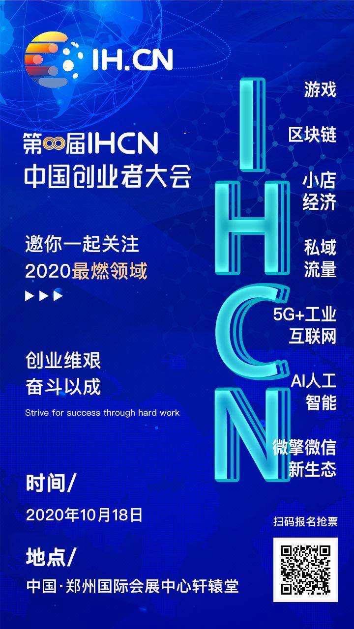 第八届IHCN中国创业者大会将于2020年10月18日在中国·郑州国际会展中心举行。本届大会以“创业维艰,奋斗以成”为主题,以中国后疫情时代新经济趋势为切入点,聚焦时代巨变下中国新商业消费模式与互联网经济发展红利期,解析消费升级、产业变革带来的创业新态势。