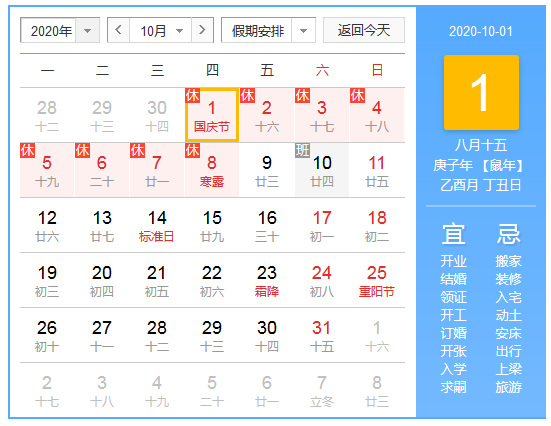 2020年国庆节和中秋节是同一天。十一国庆放假共8天,从10月1日至10月8日放假调休,10月9日正式上班,其中在9月27日(星期日)、10月10日(星期六)都需上班。根据国务院办公厅公布的《2020年部分节假日安排的通知》的有关规定,并结合基地的实际情况,现将2020年中秋节国庆节放假安排如下图:
