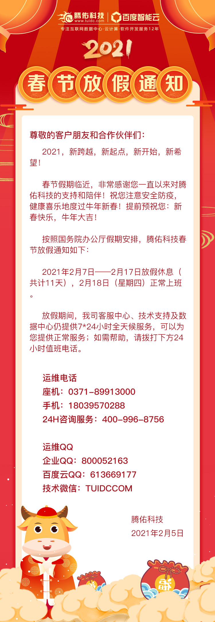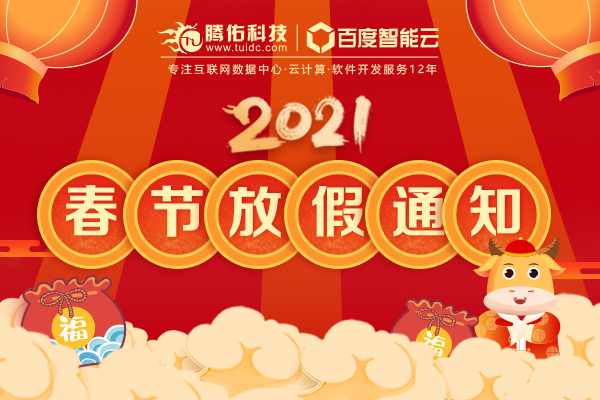 简述:尊敬的客户朋友和合作伙伴们:2021,新跨越,新起点,新开始,新希望!春节假期临近,非常感谢您一直以来对腾佑科技的支持和陪伴!提前预祝您:新春快乐,牛年大吉!根据国务院办公厅关于2021年节假日安排的