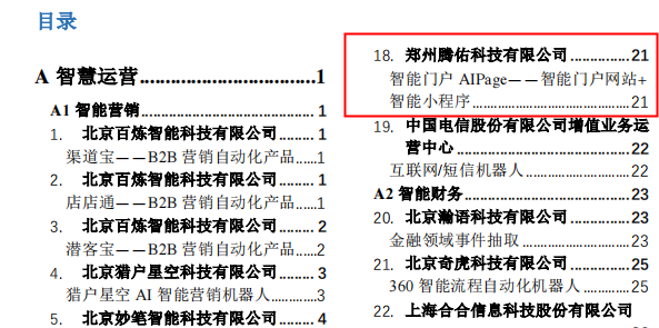 腾佑科技的“多合一智能门户网站+智能小程序产品及图像审核、OCR文字识别案例”历经多重专家的筛查、核验、评选,最终在近千中AI类产品中脱颖而出,成功入选由工业和信息化部科技司指导,中国电子信息产业发展研究院(赛迪研究院)、中国信息通信研究院 、工业和信息化部中小企业发展促进中心联合编制的“AI 精准赋能中小企业对接活动重点对接案例集”。